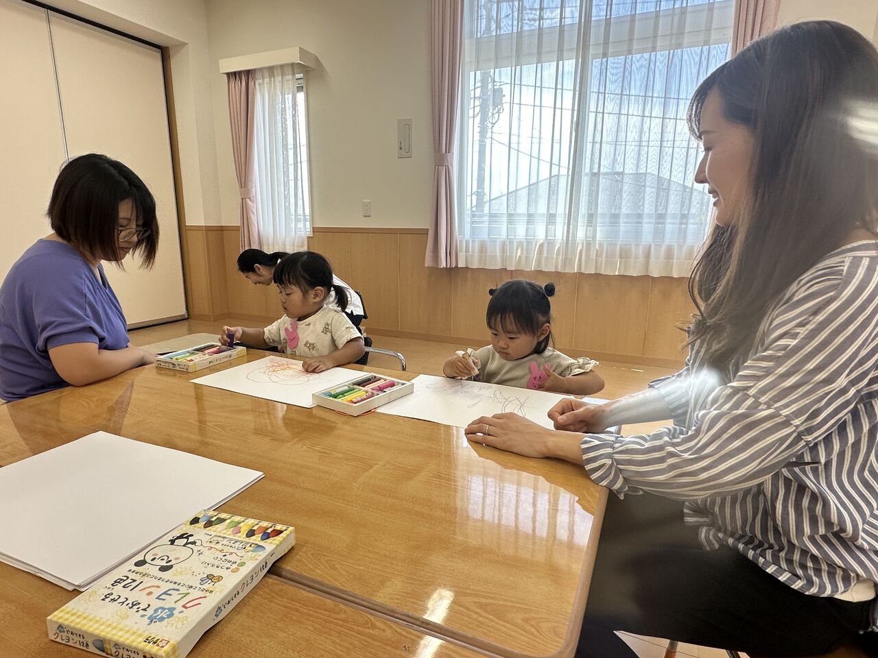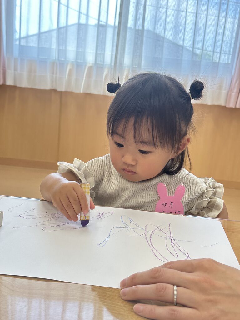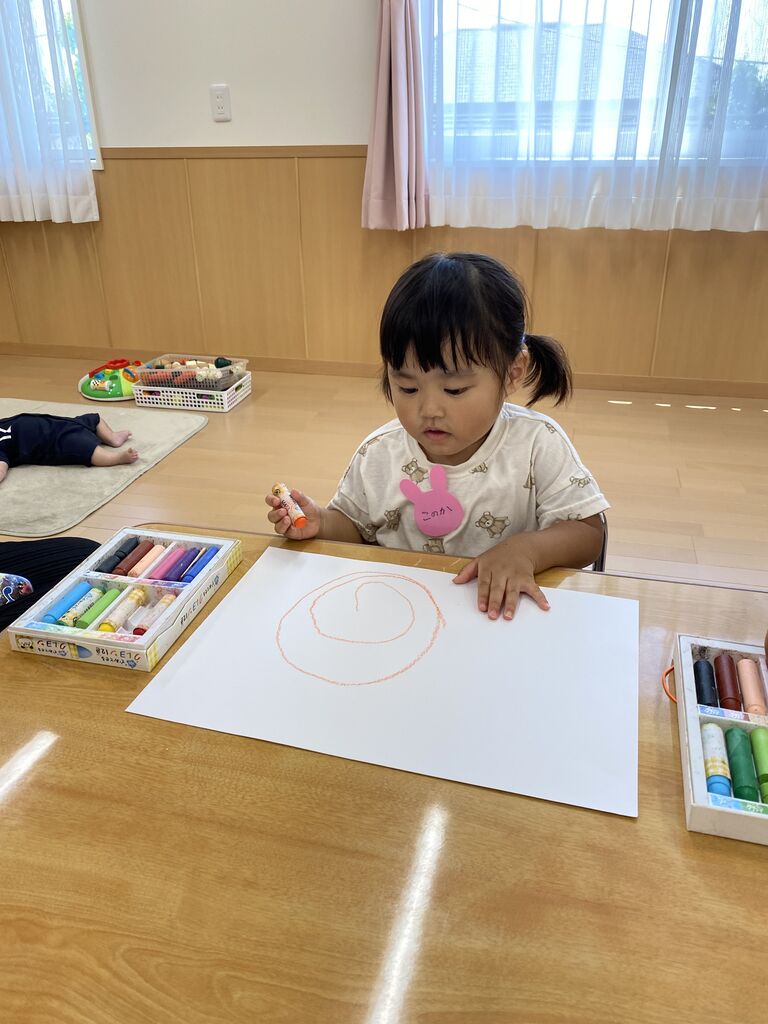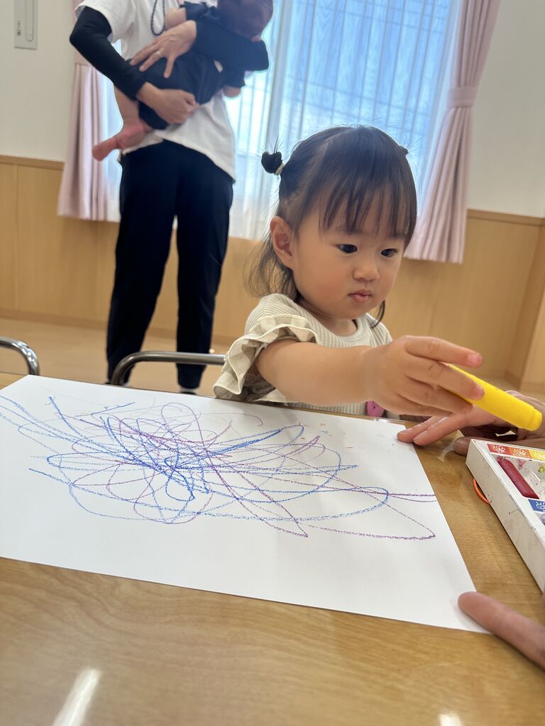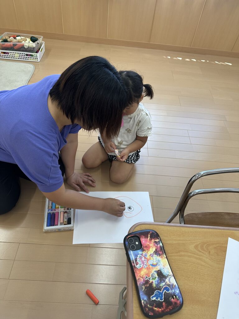 R6 親子ふれあい教室☆おえかきあそび☆ 今日は、今年度最初の親子ふれあい教室でした🎶 2組の方が参加してくれました✨ 「おはようのうた」を歌って・・・🎶 今日は「とんとんとんとん アンパンマン」の手遊びをやりました🎶 まねっこ上手にできたね!! 「だいすきぎゅっ」「どんないろがすき」の絵本を読みました♡ さあ、今日はおえかきしてみよう〜!! ままとおばけかいてみたよ👻 おもちゃでもあそんだよ。 お片付けがとってもじょうずな二人でした✨ ぼくもごろーん🎶 色んな色を使ってとってもかわいくお絵描きできました✨ 次回は5月22日(水)を予定しております😊 たくさんのご参加お待ちしております 関連